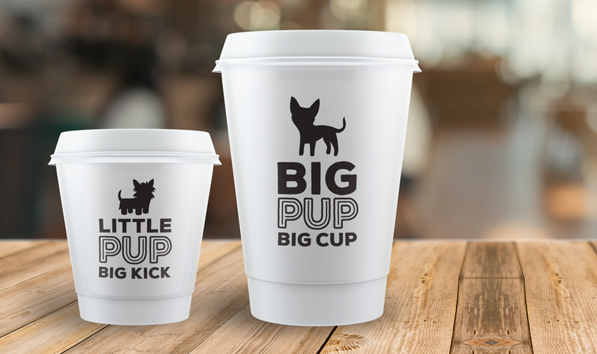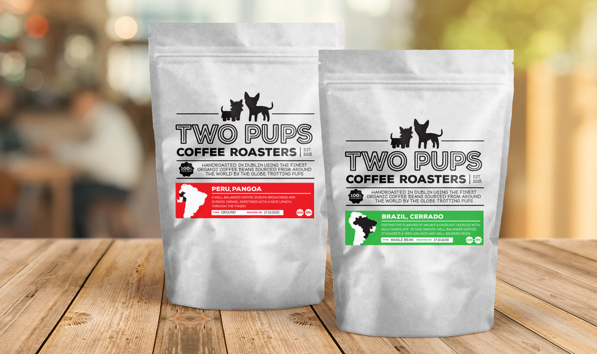 Art direction, branding, and packaging design for a coffee roasters and cafe based in Dublin, Ireland. This is a branding project for a coffee roasters and cafe called Two Pups. It would have to stand up to a lot of competition in the marketplace in contemporary Dublin so the brand needed to communicate what the quality of the offering and service do but also bring across some of the fun and individuality of the founders, the ‘two pups’. Applications of branding and graphics applied across typical coffee shop touch point items such as cups, menus and bags of coffee.