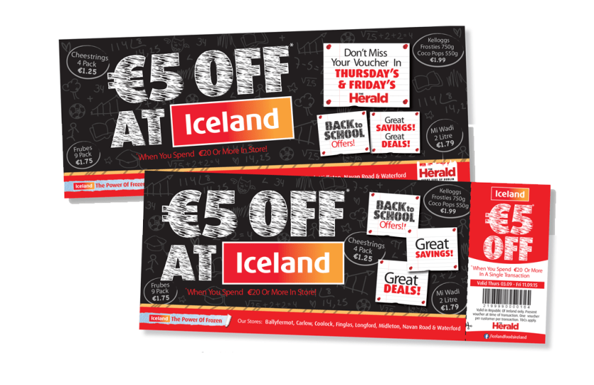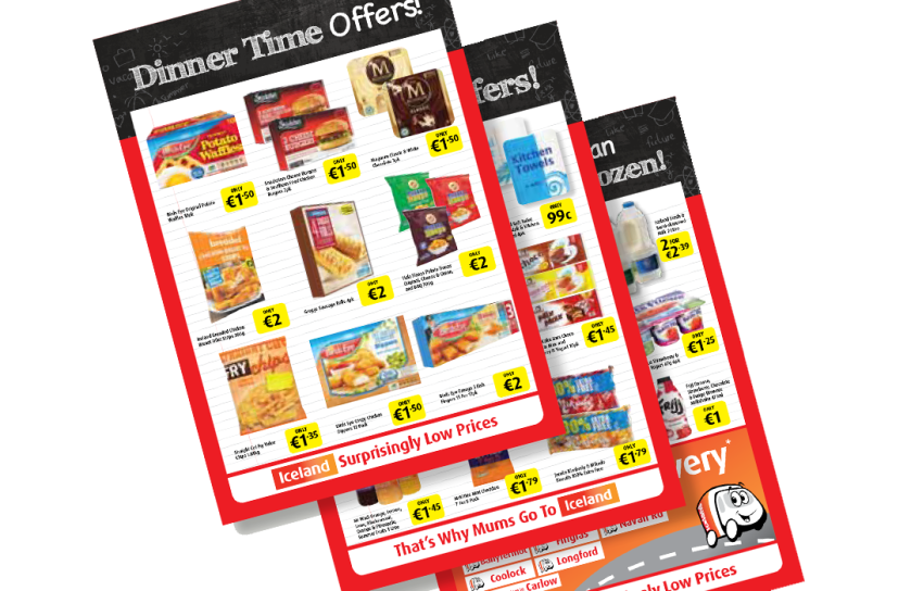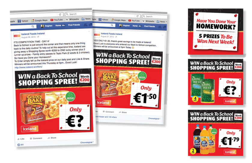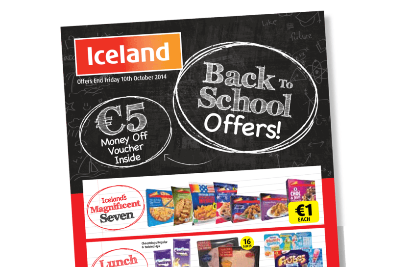 Back to School promo campaign for Iceland where a consistent theme is applied across leaflets, press advertising in the Evening Herald and online via social media.