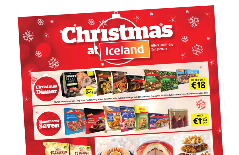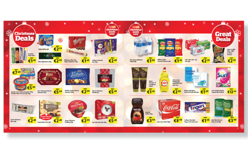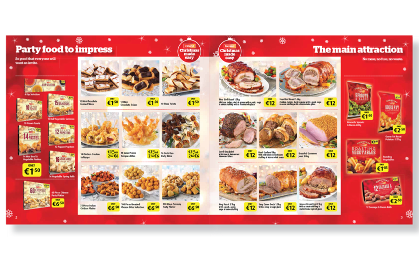 A 12 page Christmas themed promotional flyer promoting the Iceland range of Christmas themed products including party food, joints, cakes, desserts and their range of Christmas essentials. A flexible visual layout was used with some pages using mainly product photography and other pages using pack shots.