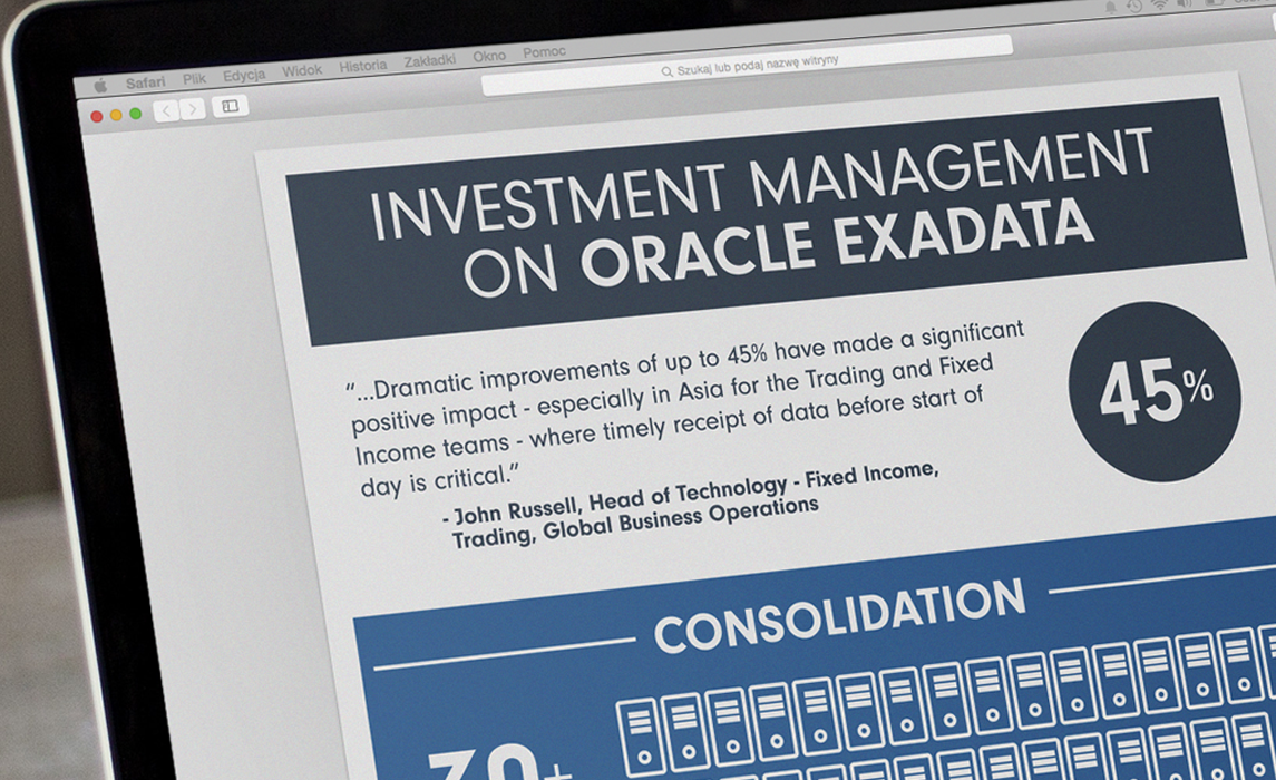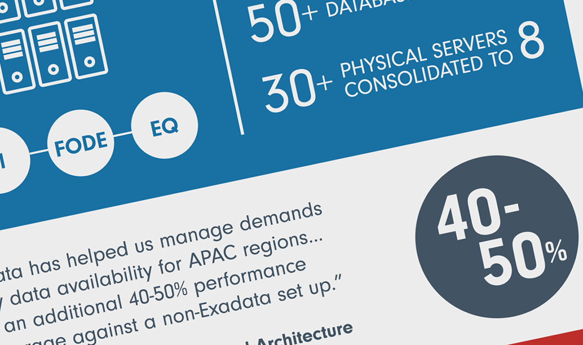 I produced an info-graphic for one of Fidelity International’s technology teams to show the benefits of moving to Oracle Exadata platform. Clarity was key to communicate the info and stats and I did this balancing simple, clear numbers with other visual devices that support each other and I use strong colours to divide up the graphic area and guide the read through the piece.