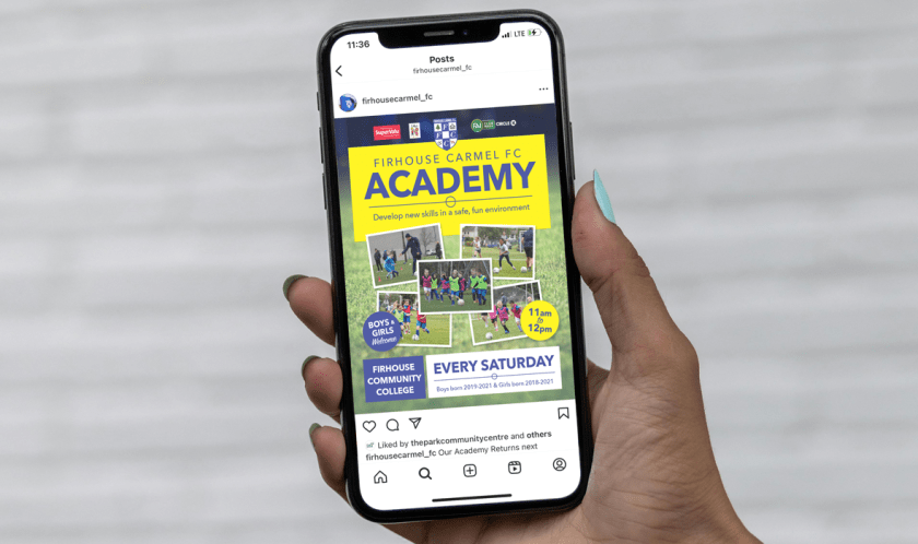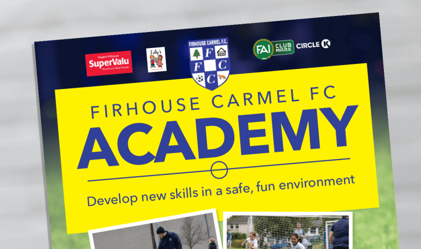 This was a poster produced for Firhouse Carmel FC based in Firhouse in Dublin. The goal was to promote their academy for young boys and girls to get them started off playing football in a safe and fun environment. I used the club colour colours of blue and yellow to emphasise important information and dynamic images of current academy players to entice parents and to enrol their children. The posters were printed and distributed in local schools, including a Gaelscoil (Irish language school) so I produced an Irish language version for this school. It was also promoted on the clubs social media channels, including Instagram.