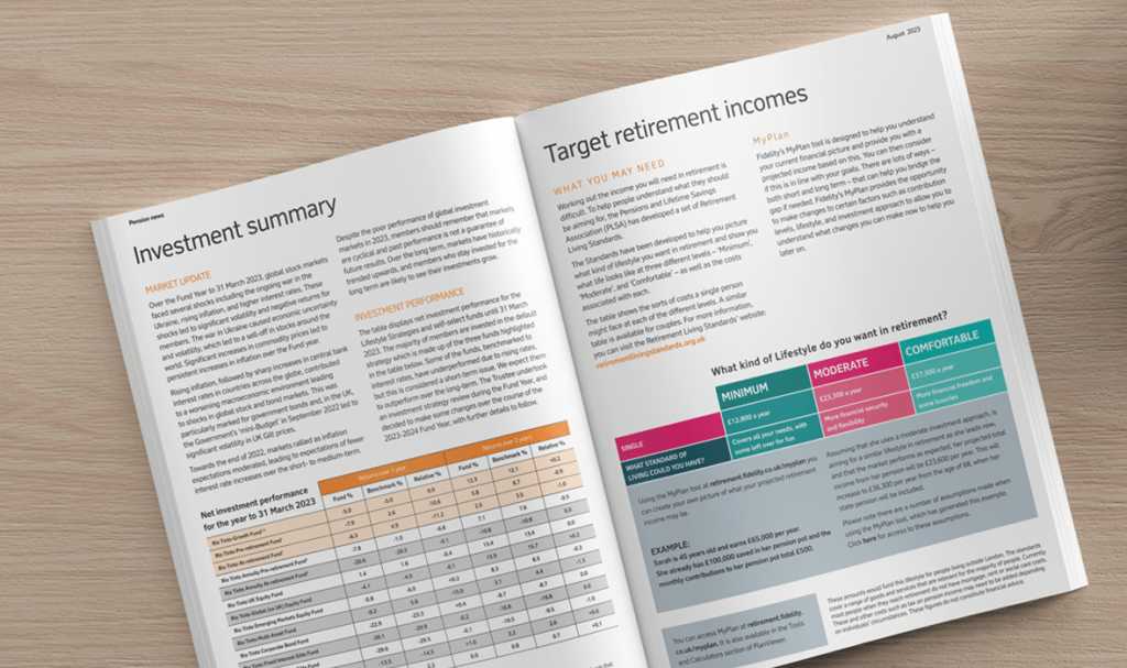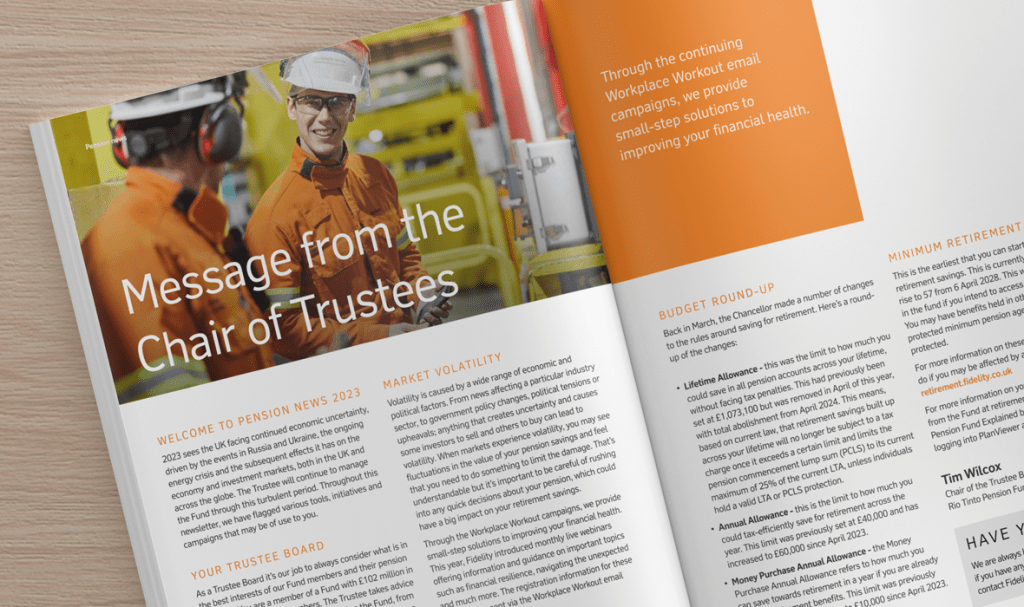 This was a newsletter created for Rio Tinto for members of their pension plan which was managed by Fidelity International. I used their brand guidelines to create a newsletter that fitted in with the other member communications that Rio Tinto distributed to their employees – using their typefaces, colours, graphic devices and on brand photography.