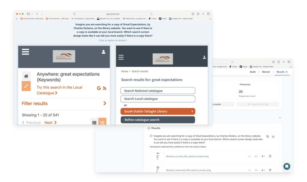 To find out I decided to test how the current design and a proposed design for the search page on mobile tested against each other with users. I set up an a/b test on both search page designs using Lyssna.com with each variants side-by-side.