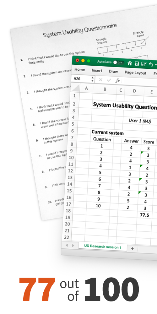 I’ve calculated the score using SUS calculator in Excel I’ve created using relevant formulas: 77 0ut 0f 100.